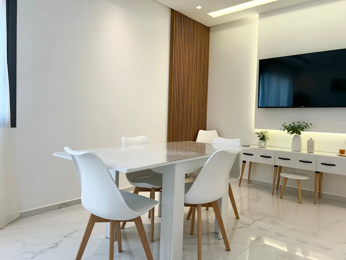 – Pièce principale: Un grand salon 6 places, un espace salle à manger et une TV 55″.