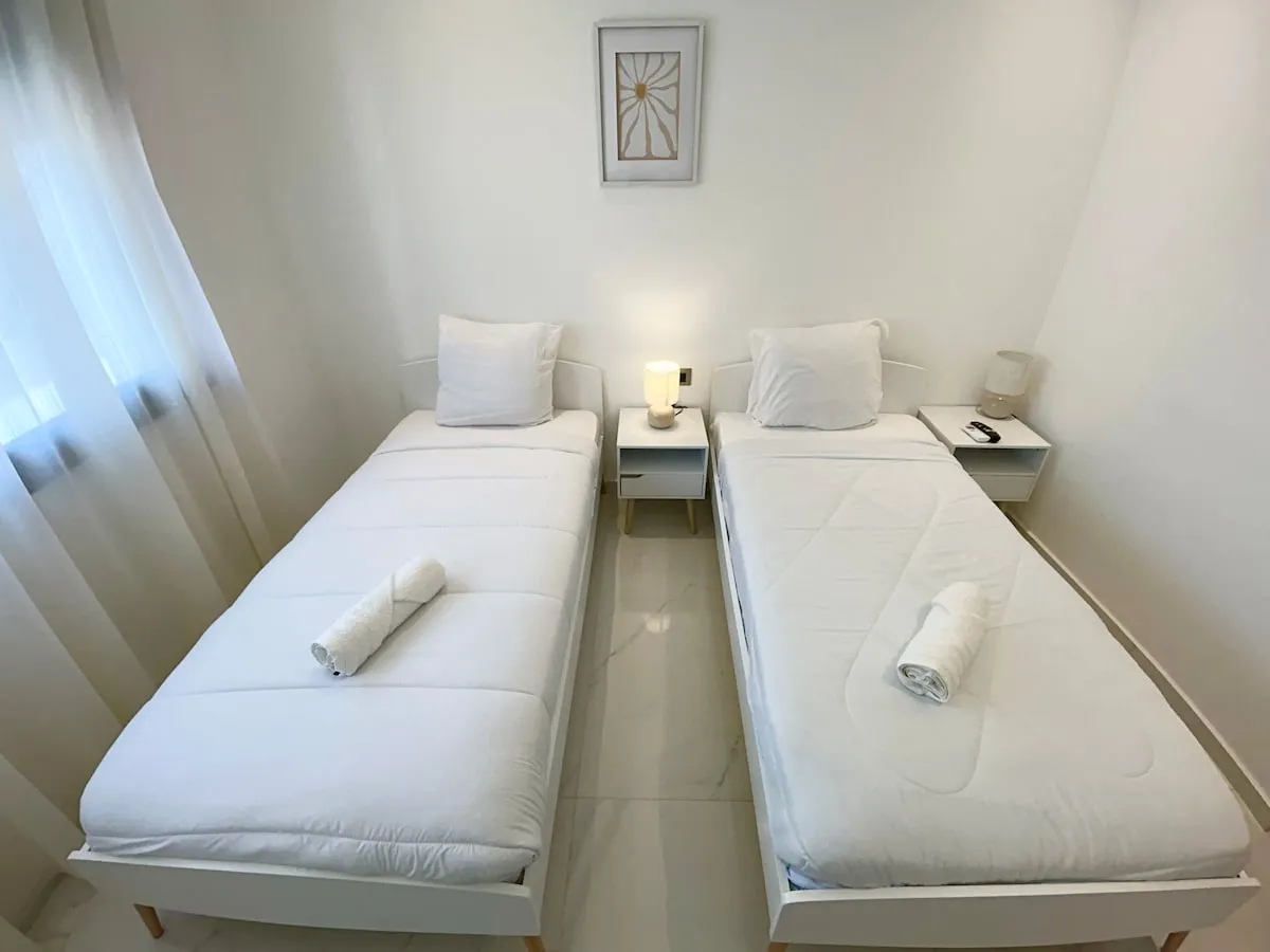 L’appartement dispose de 2 chambres, 2 salles de bain, une cuisine moderne et un petit patio, le tout dans un décor épuré et soigné.
