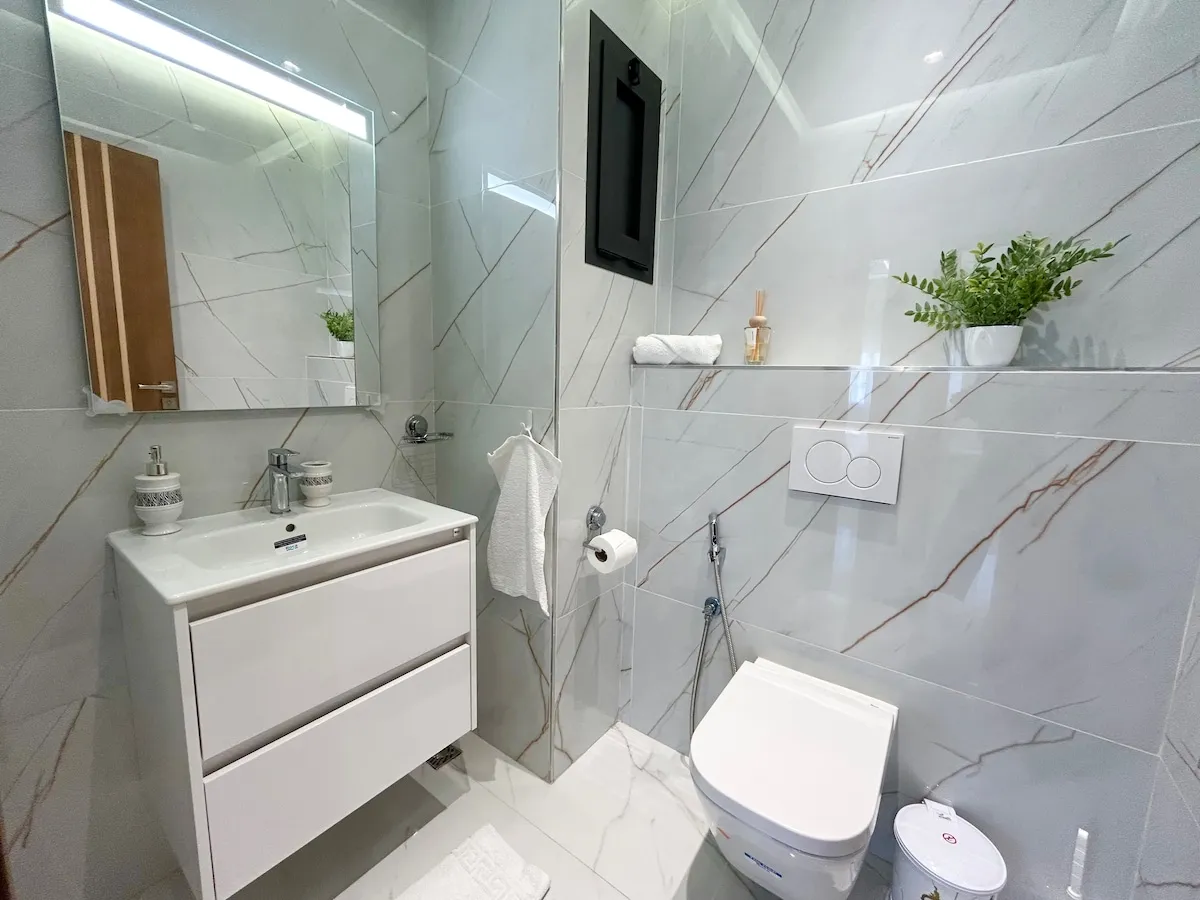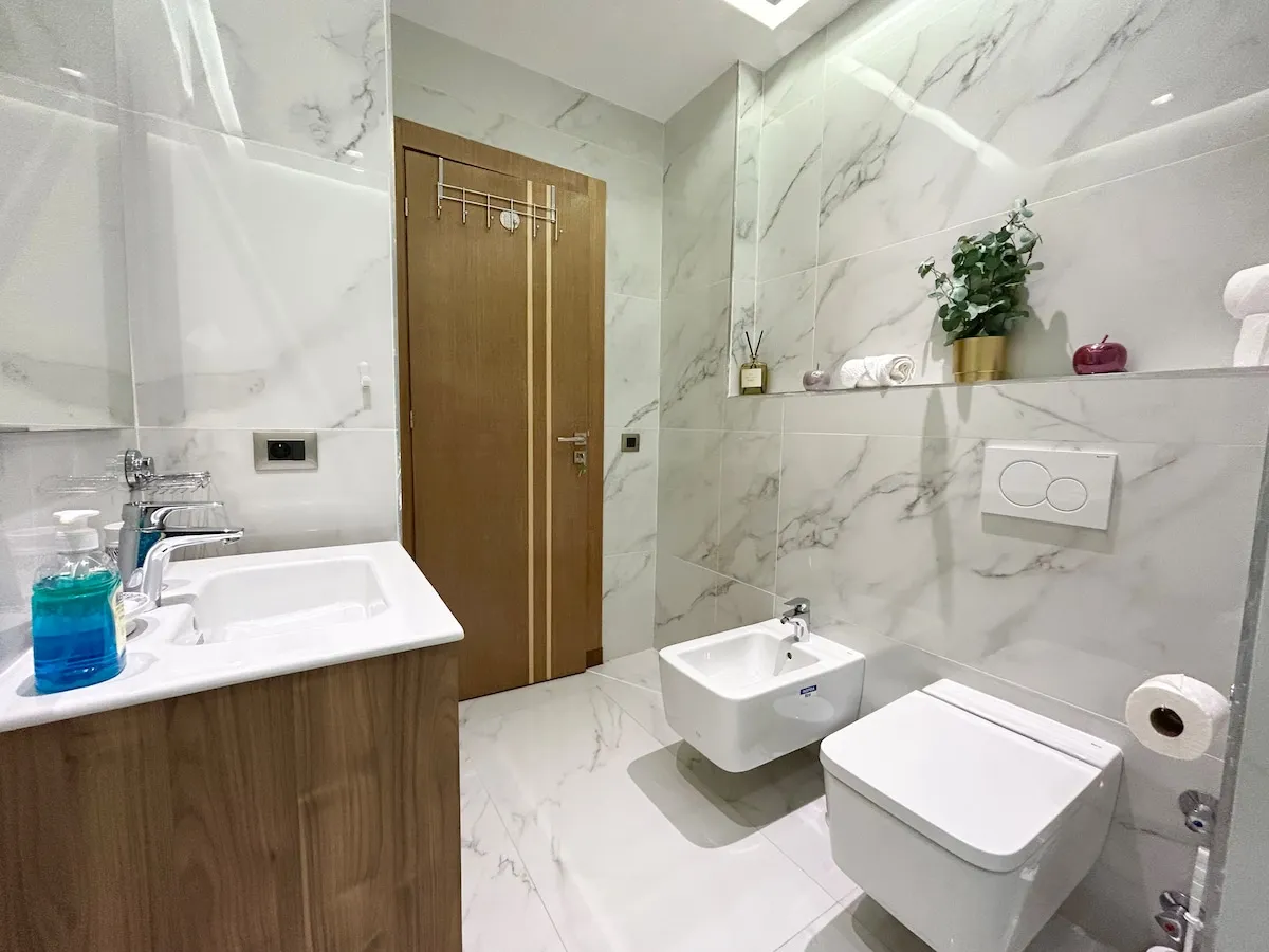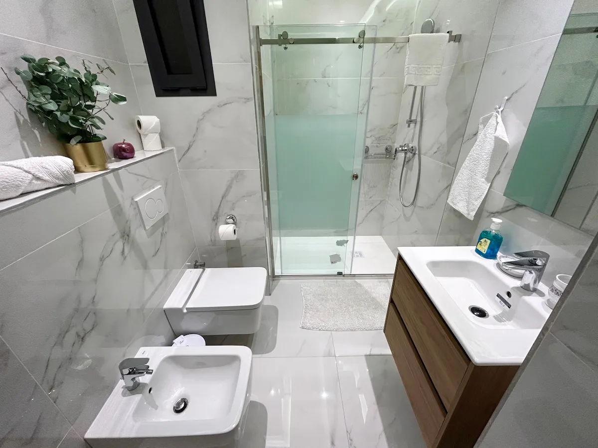 – Salles de bain: Une salle de bain moderne avec douche italienne ainsi qu’une autre toilette de service avec lavabo.