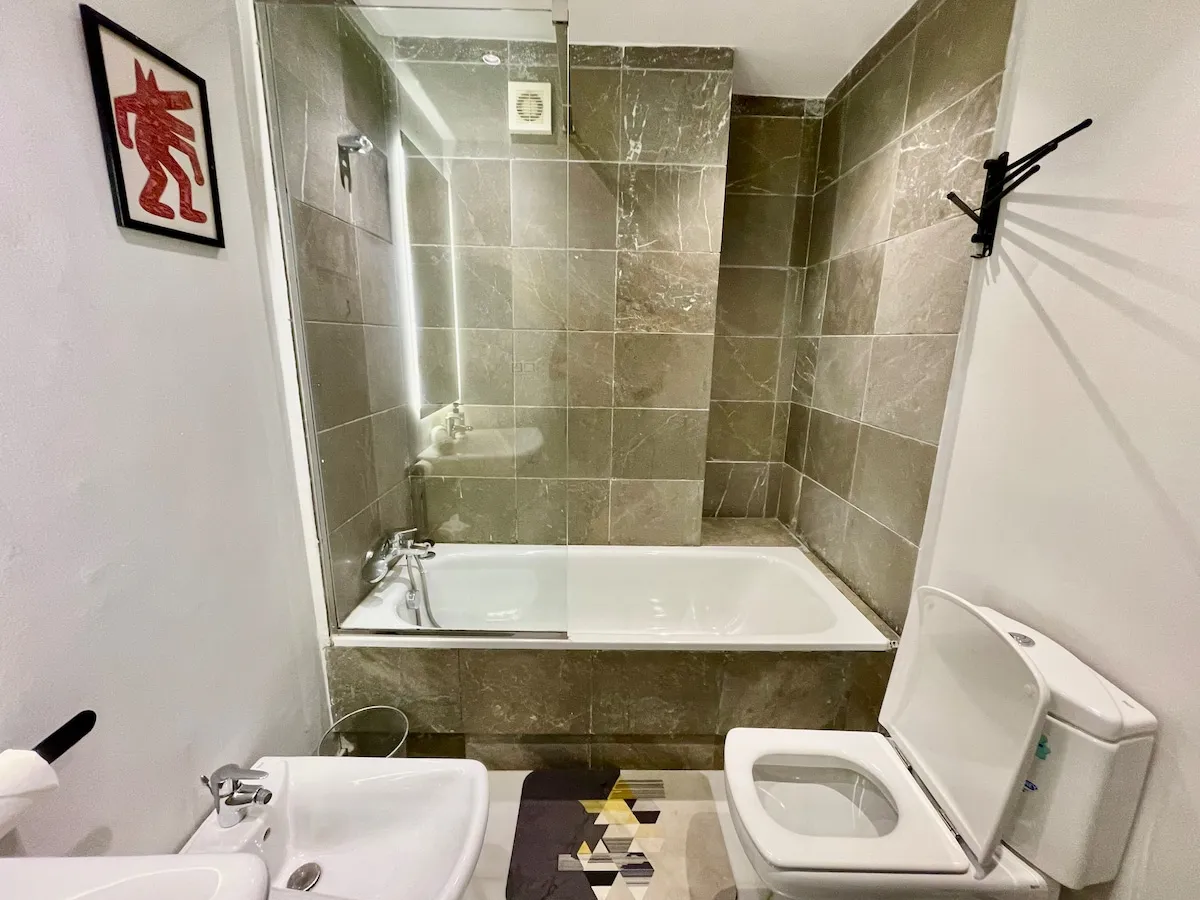 – 1 chambre avec 1 lit double et salle de bain avec douche italienne.