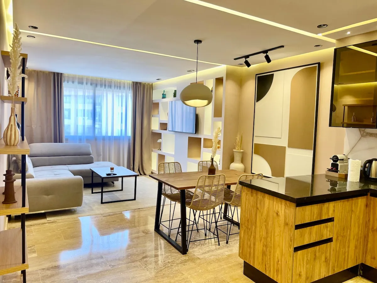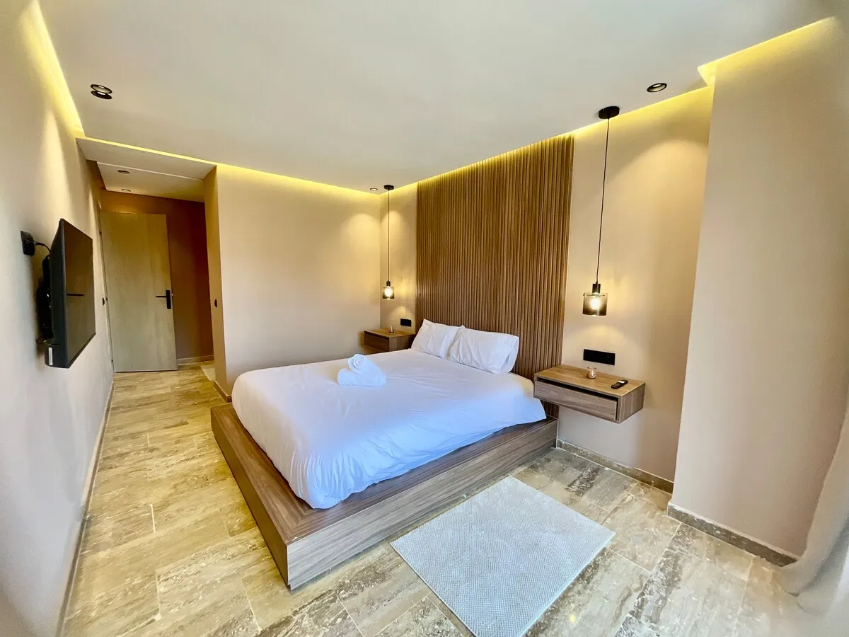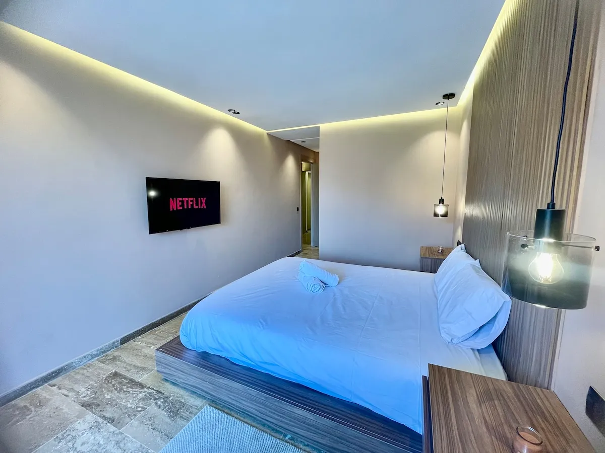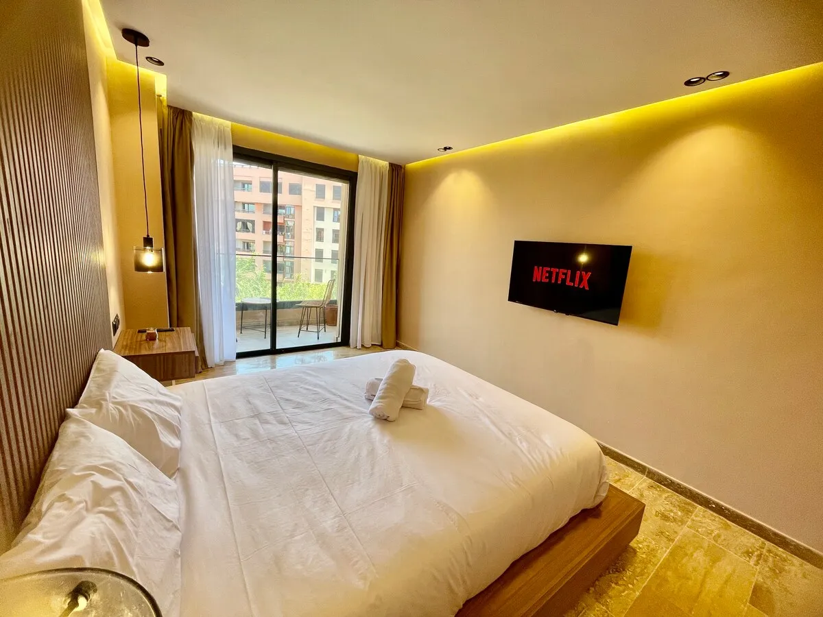 Séjournez dans une suite moderne et minimaliste, située dans un immeuble flambant neuf au cœur de Guéliz.