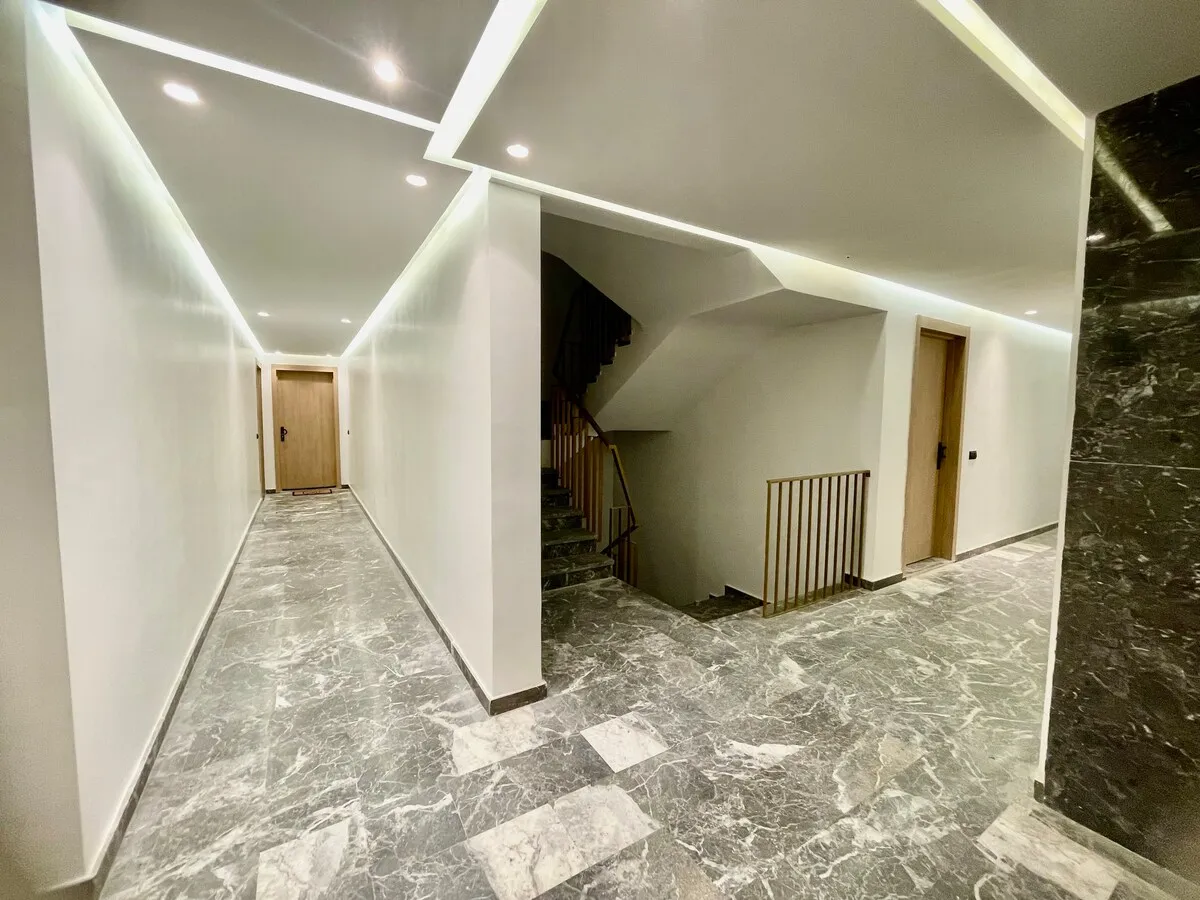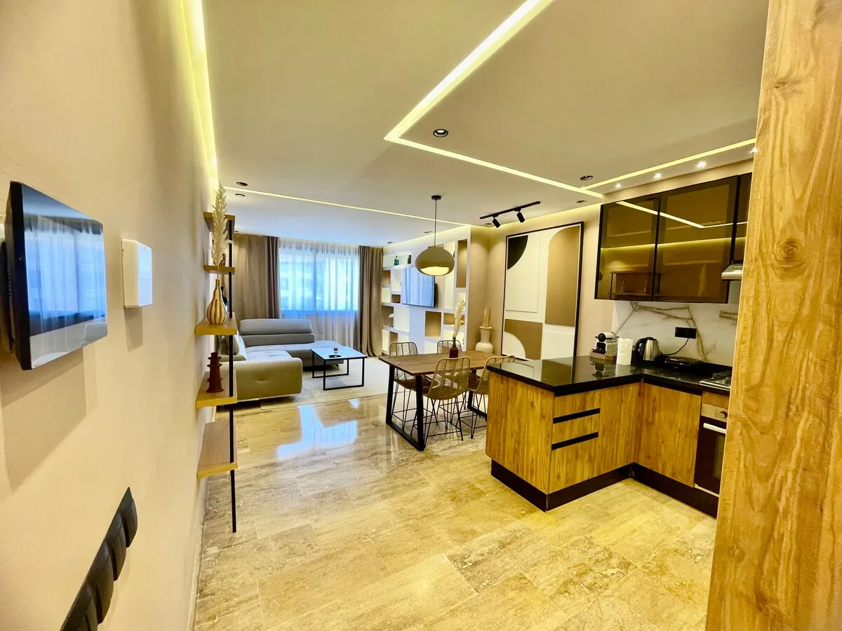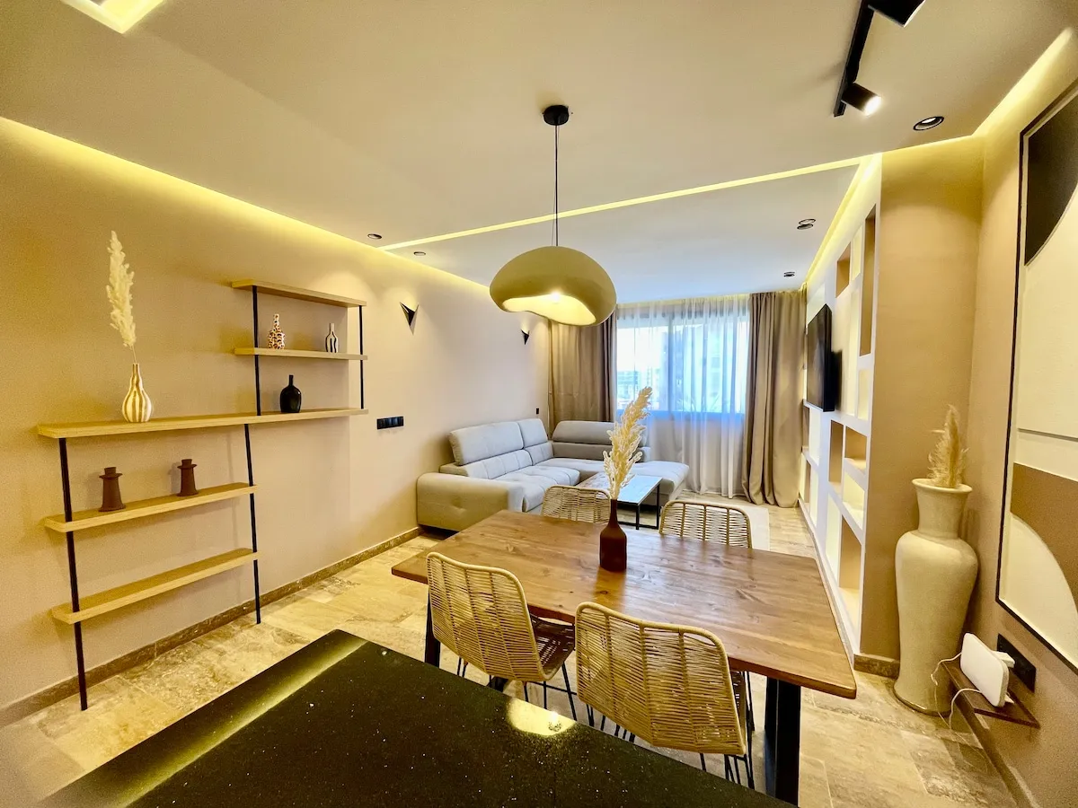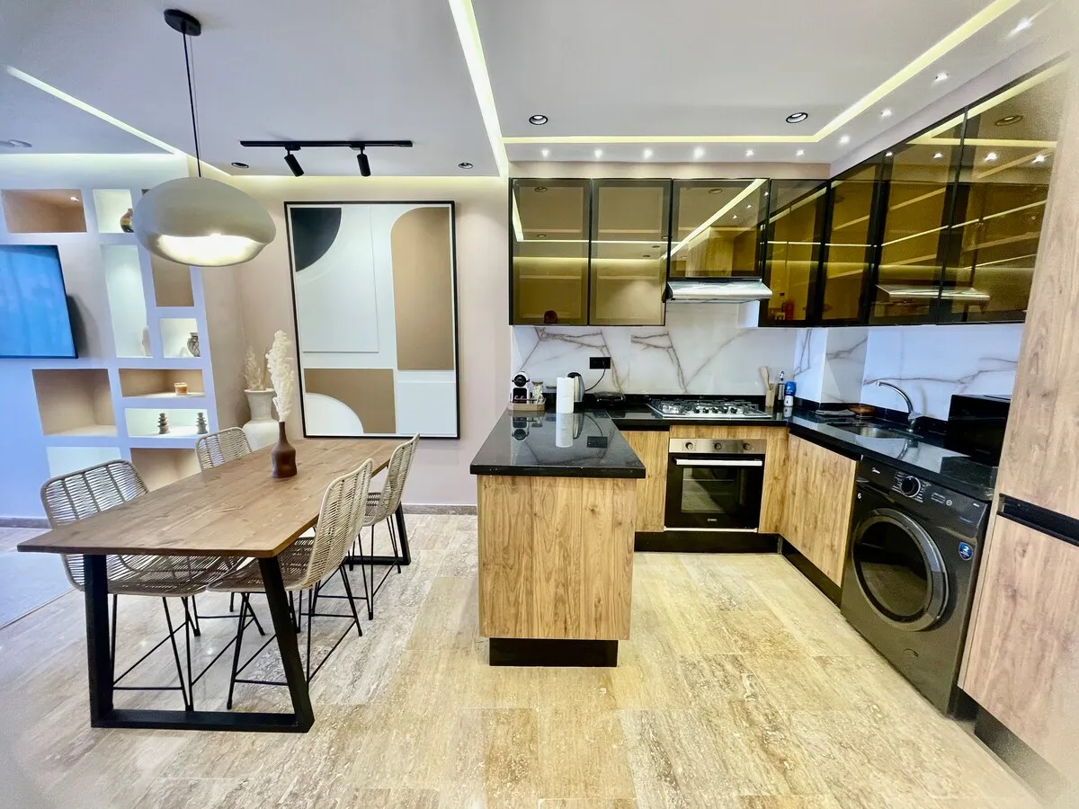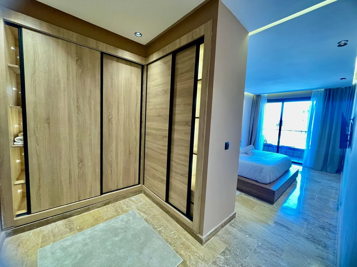 Séjournez dans une suite moderne et minimaliste, située dans un immeuble flambant neuf au cœur de Guéliz.