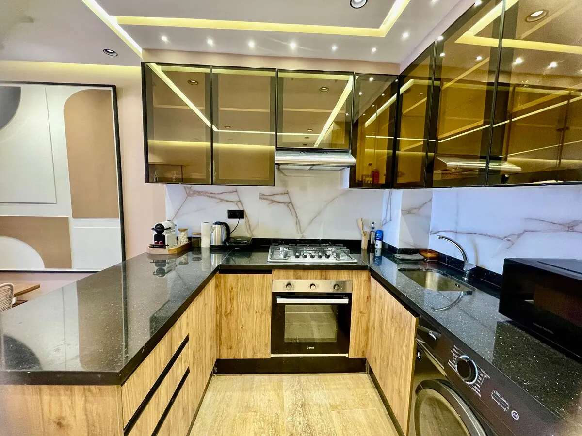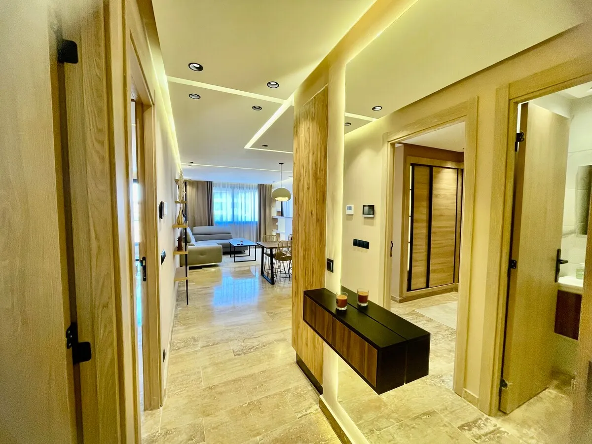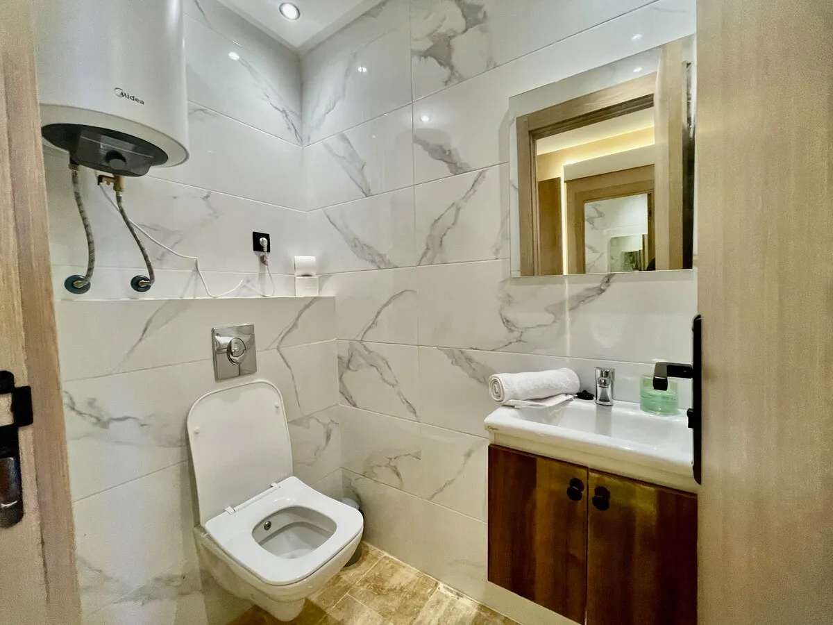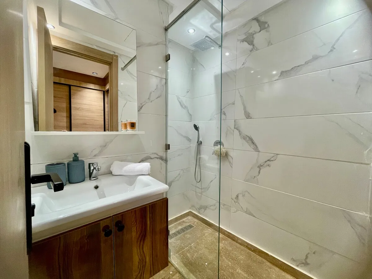 Séjournez dans une suite moderne et minimaliste, située dans un immeuble flambant neuf au cœur de Guéliz.