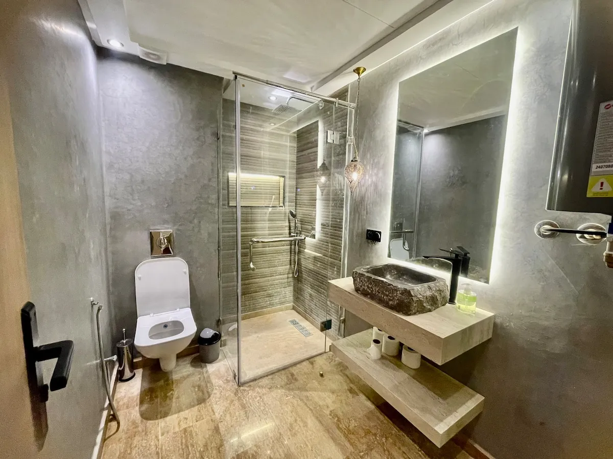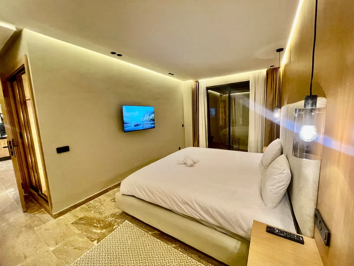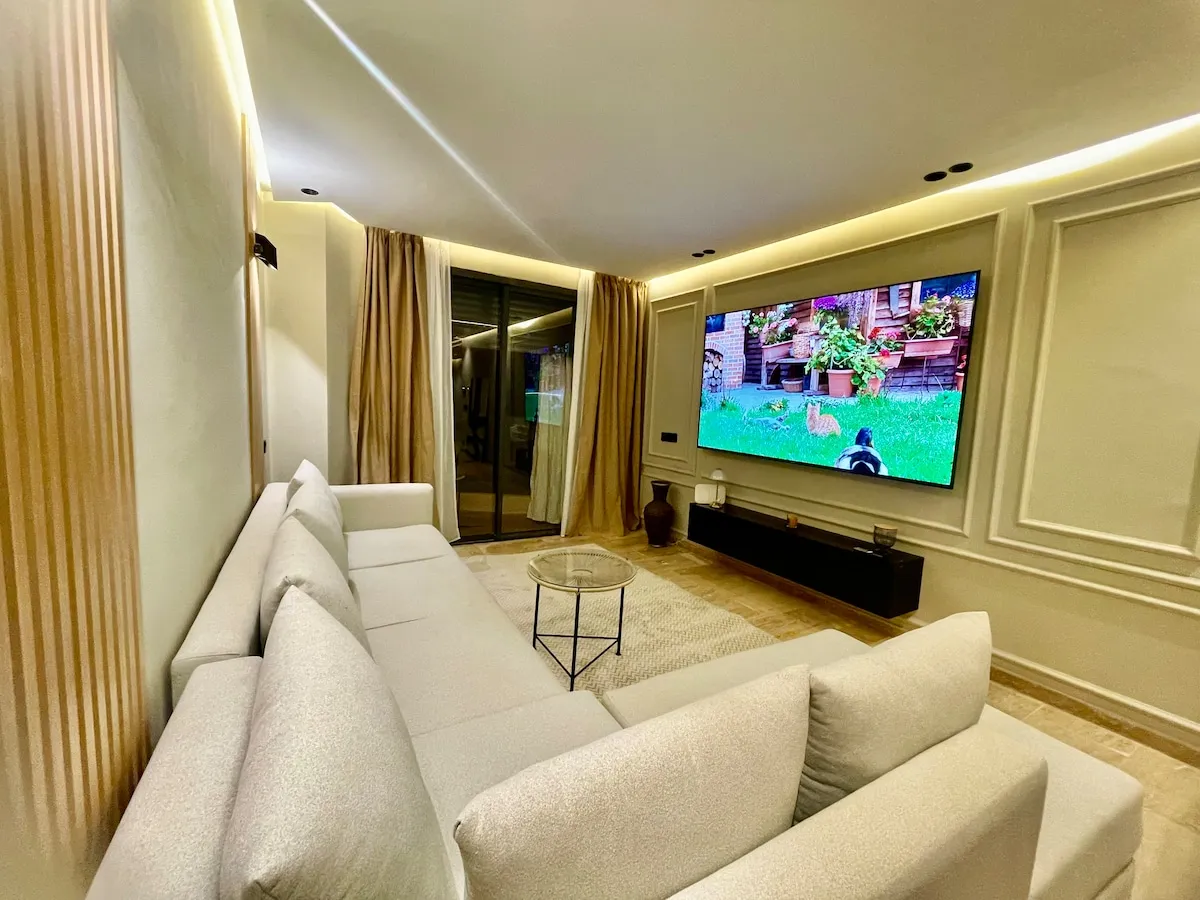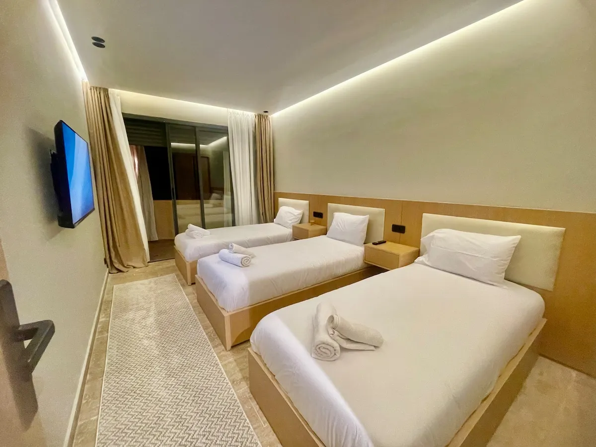 Ce logement privé, lumineux et entièrement équipé, vous offre un confort optimal avec deux belles chambres, un salon spacieux avec une incroyable TV 84 pouces, 3 balcons et une cuisine moderne. Idéal pour une escapade entre amis, en famille ou un voyage d’affaires, il se trouve à seulement 3 minutes à pied du Carré Eden et des meilleures adresses de Marrakech.