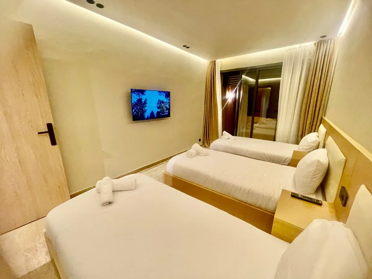 • Chambre 2: Une grande chambre avec 3 lits simples une TV 42, un placard ainsi q’un balcon