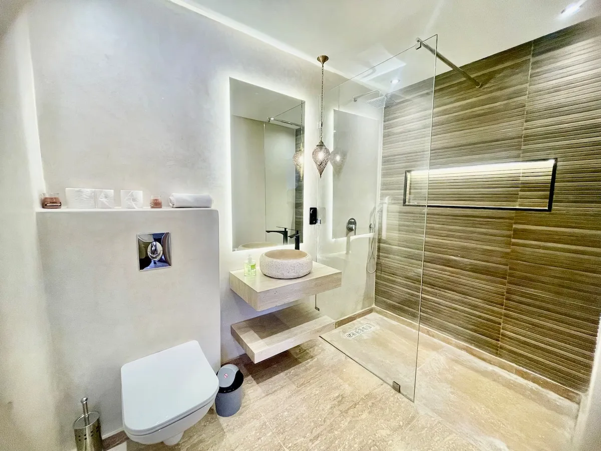 • Chambre 1: Une grande chambre avec un lit 2 places King Size, une TV 42, un dressing, une salle de bain attenante avec douche italienne, ainsi q’un balcon
