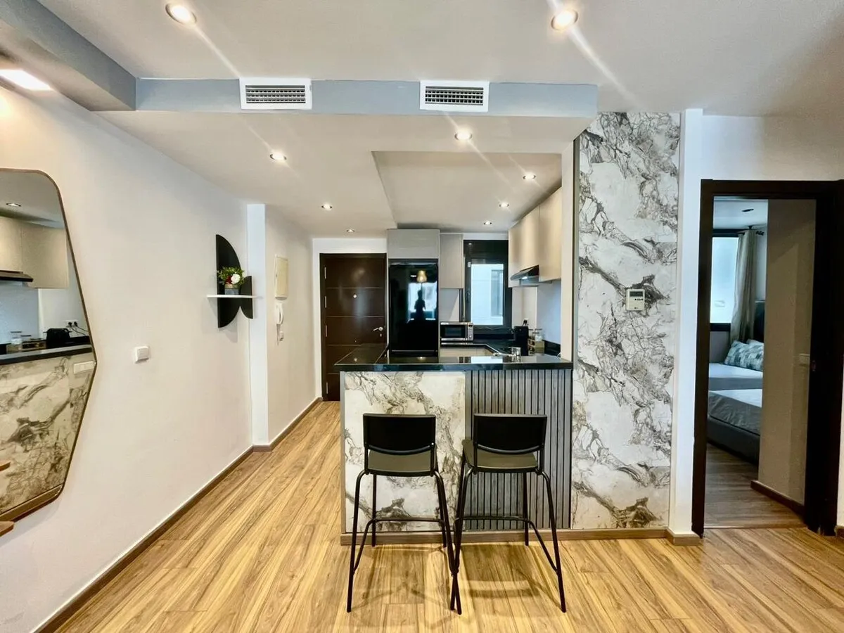 – Cuisine: Une cuisine américaine avec comptoir et chaises hautes, toute équipée.