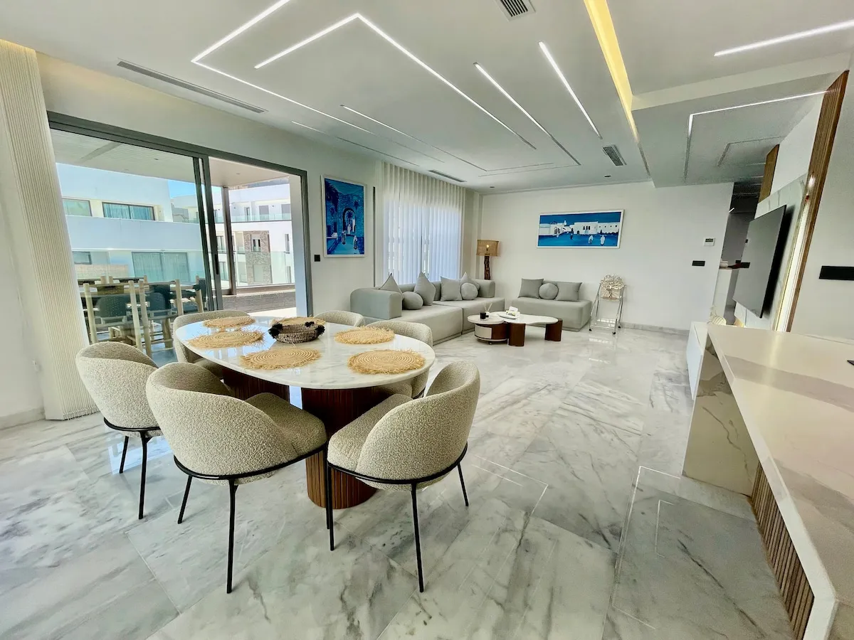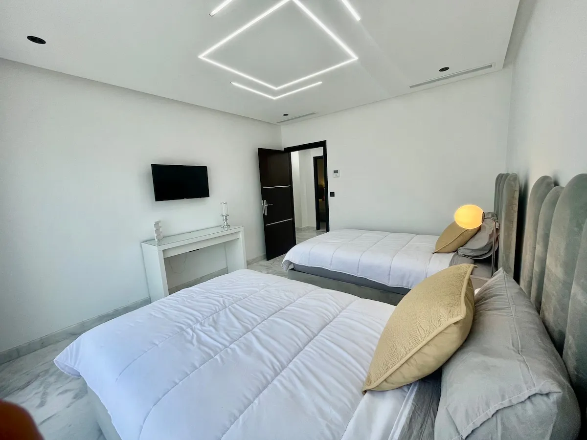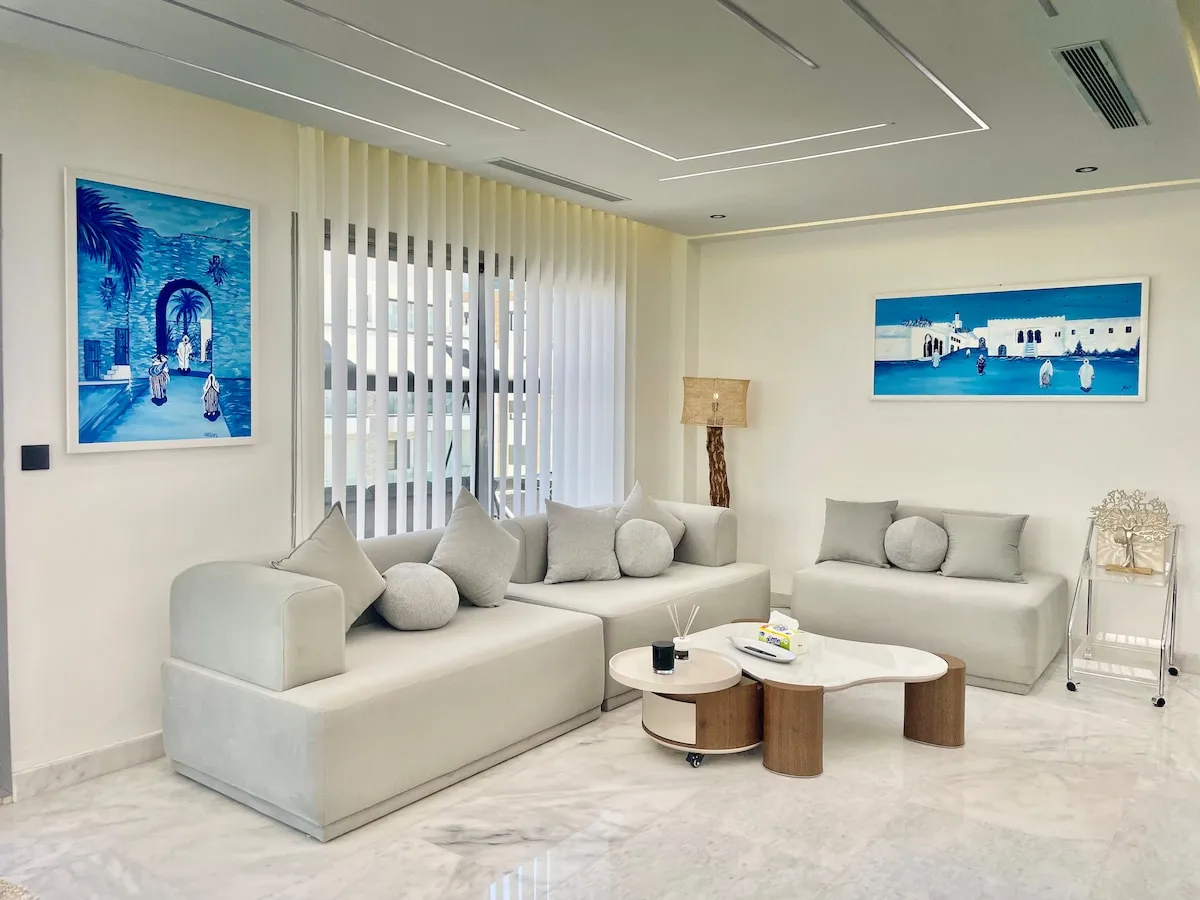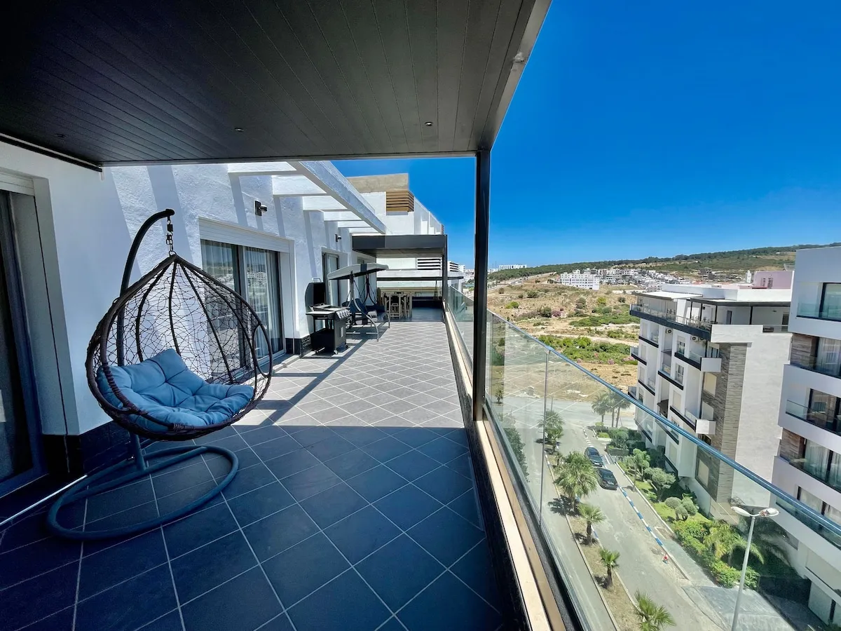 Profitez du jacuzzi et du barbecue pour des moments de détente inoubliables. La cuisine entièrement équipée et le salon élégant avec sa grande TV offrent un espace idéal pour se relaxer. Idéal pour les familles, ce logement est parfait pour un séjour luxueux et confortable au quartier Malabata.