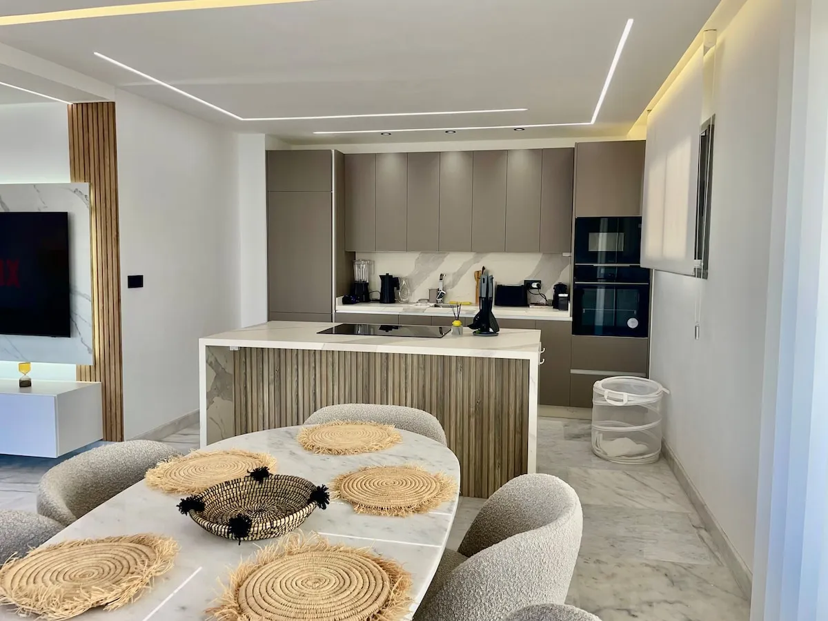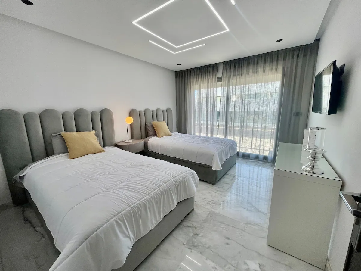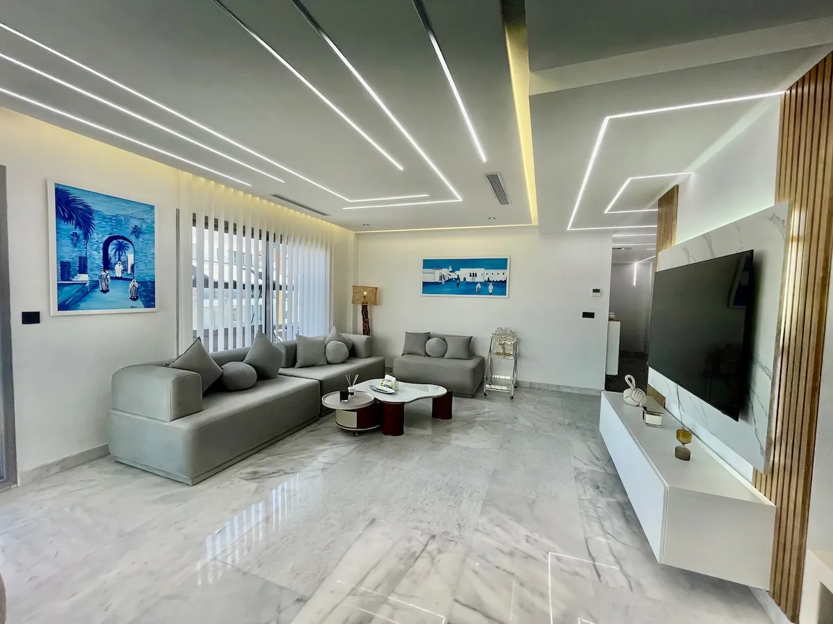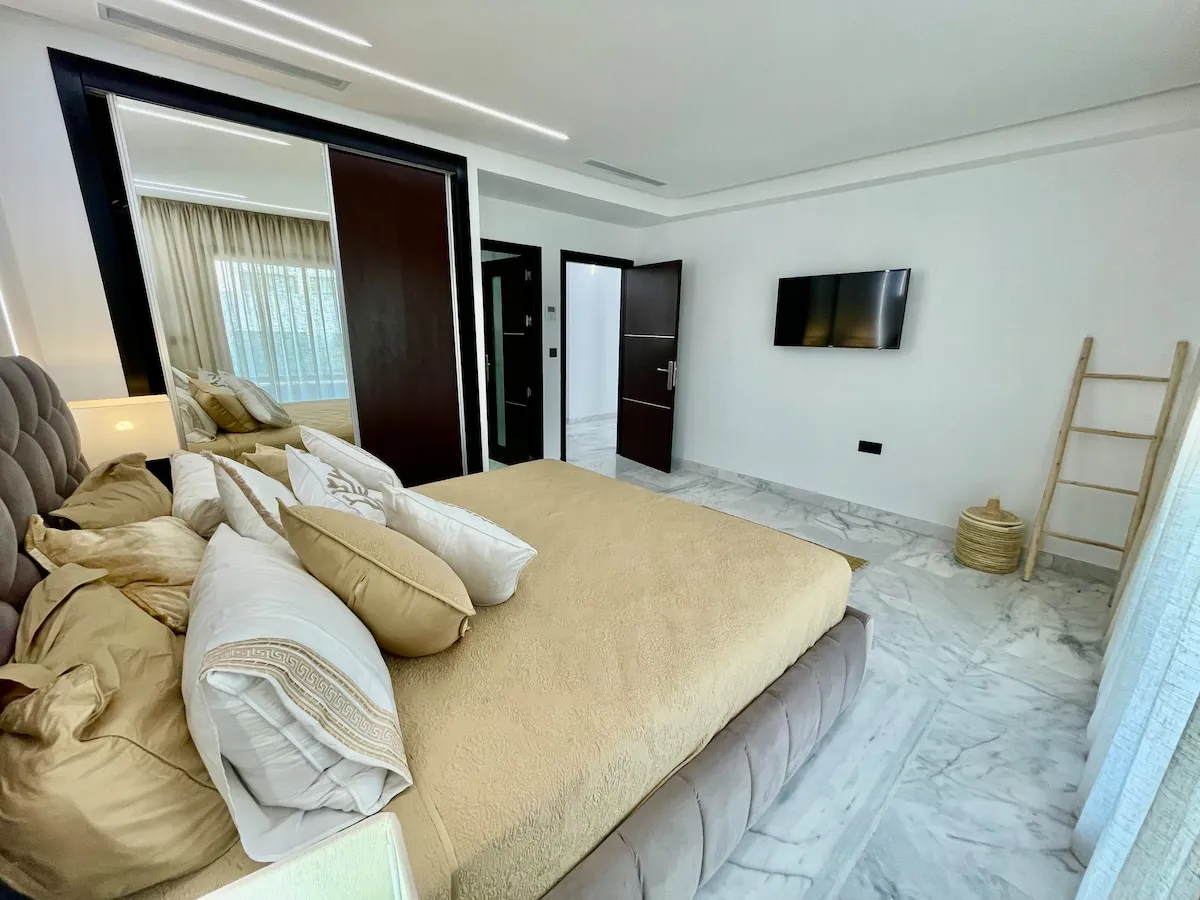 Profitez du jacuzzi et du barbecue pour des moments de détente inoubliables. La cuisine entièrement équipée et le salon élégant avec sa grande TV offrent un espace idéal pour se relaxer. Idéal pour les familles, ce logement est parfait pour un séjour luxueux et confortable au quartier Malabata.