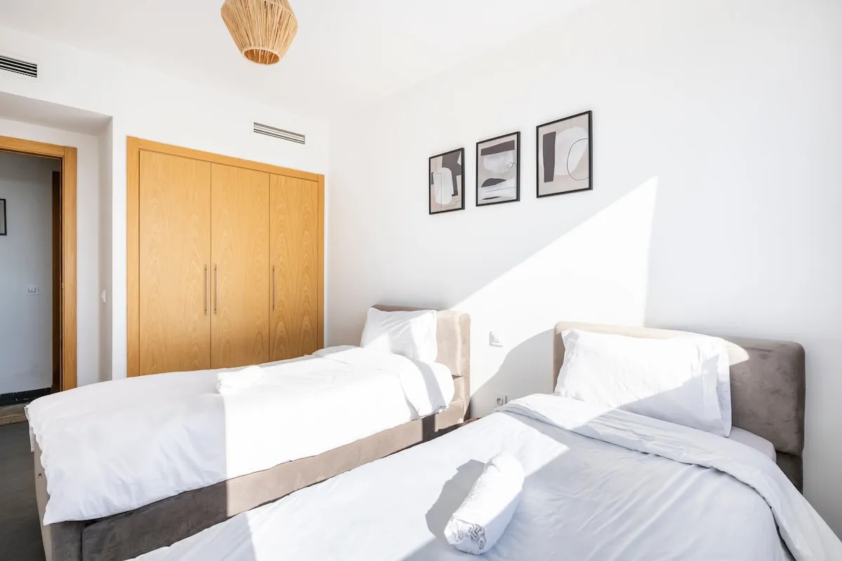 – 2 chambres: Une suite avec lit 2 places, dressing et salle bain avec baignoire. La deuxième chambre contient 2 lits simple et un placard.