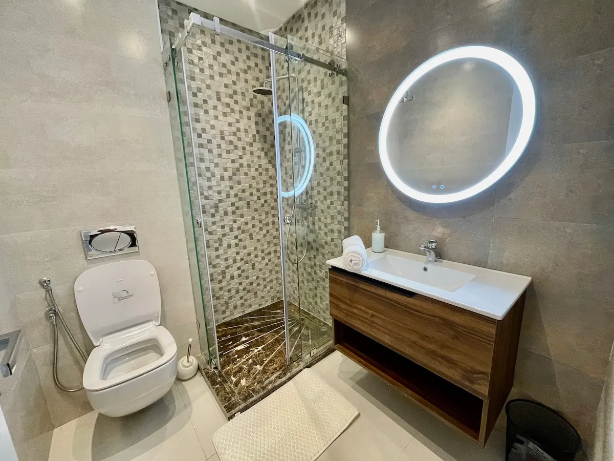 – Salle de bain: Salle de bain moderne avec douche italienne.